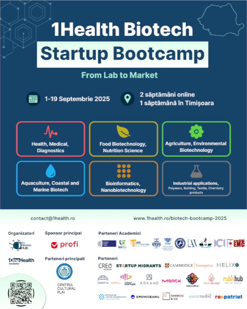 BioMentorHub, organizație independentă și nonprofit dedicată sprijinirii tinerilor cercetători din domeniul științelor vieții din România și diaspora, a lansat oficial 1Health Biotech Startup Bootcamp – primul program de antreprenoriat din România axat exclusiv pe biotehnologie aplicată. Acest bootcamp face parte din inițiativa One Health Incubator, care urmărește să stimuleze formarea de noi startup-uri biotech în România, valorificând rezultate de cercetare cu aplicații în sănătatea umană, animală și a mediului.