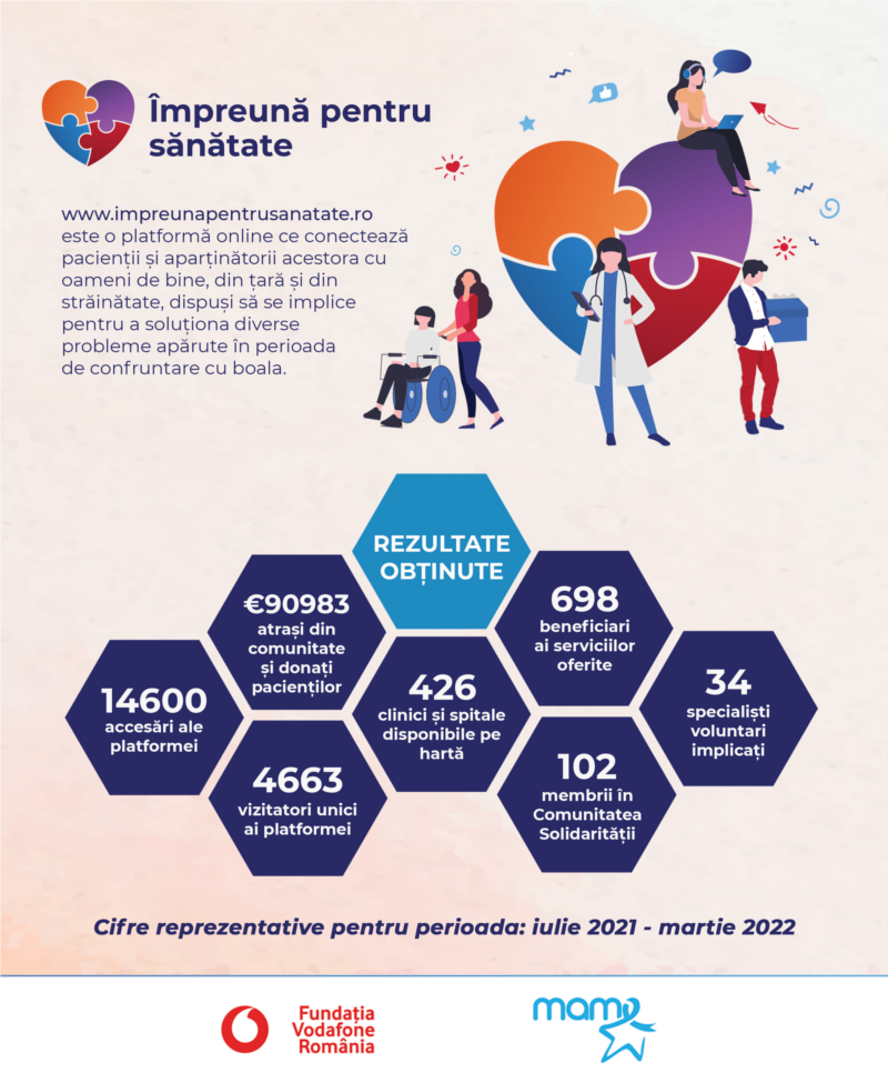 În perioada iulie 2021 – martie 2022, platforma www.impreunapentrusanatate.ro, gestionată de Asociația M.A.M.E în beneficiul pacienților diagnosticați cu cancer sau cu alte afecțiuni grave, a fost accesată de aproape 14.600 de ori și a preluat și rezolvat 428 de cereri de ajutor venite de la bolnavi sau de la aparținătorii lor din întreaga țară. Acestora li se adaugă alte 250 de cazuri - mame și copii, victime ale războiului din Ucraina, care au primit cazare gratuită, sprijin cu traduceri de documente medicale, conectarea cu clinici și spitale, medicamente sau alte bunuri de primă necesitate.