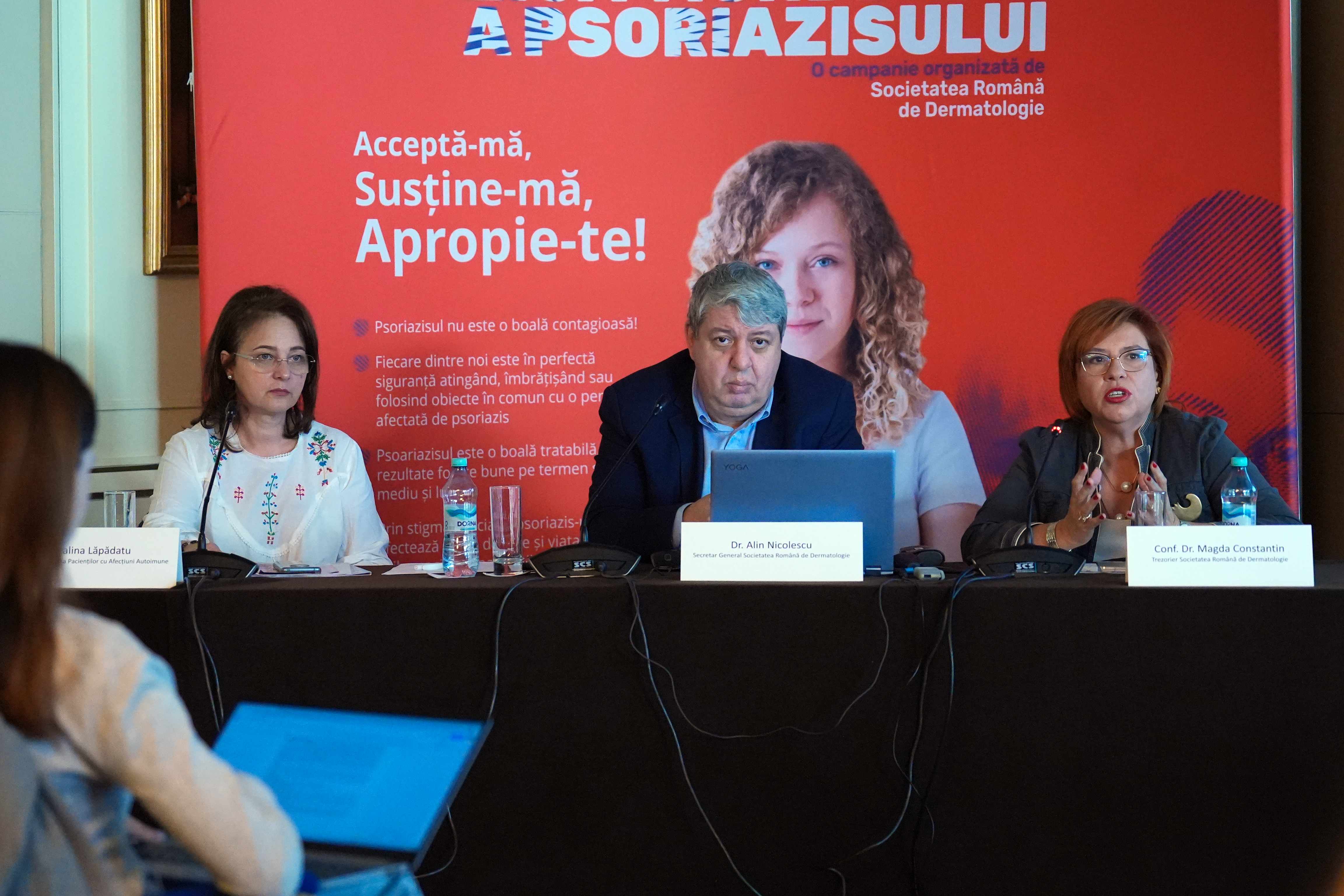 „Unul dintre principalele noastre obiective este să creștem procentul de diagnosticare și tratare corectă a celor afectați de psoriazis. Cu tratamentul corect, putem îmbunătăți calitatea vieții pacienților și asigura integrarea lor socio-profesională. În acest moment, pacienții cu psoriazis moderat și sever din România beneficiază în mod gratuit de terapiile biologice disponibile la nivel mondial. De asemenea, este foarte important să transmitem oamenilor că psoriazisul nu este o boală contagioasă și cei care sunt afectați de ea nu trebuie stigmatizați și izolați. Fiecare dintre noi este în perfectă siguranță atingând, îmbrățișând sau folosind obiecte în comun cu o persoană afectată de psoriazis.” spune Dr. Alin Nicolescu, Secretar General al Societății Române de Dermatologie.