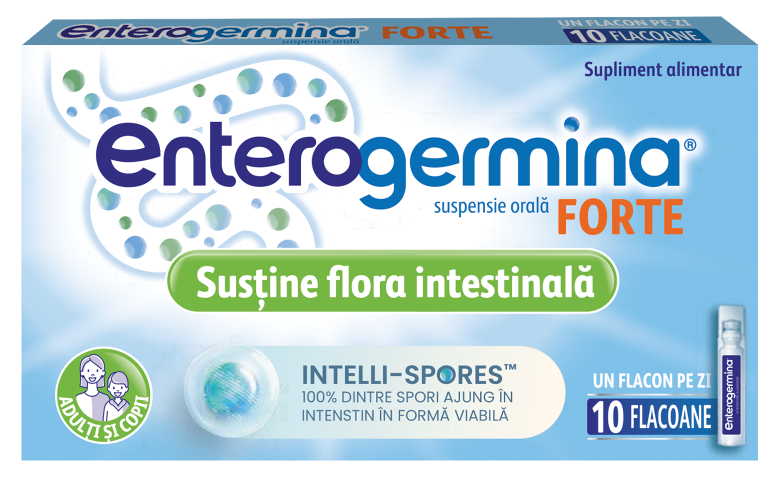 Enterogermina® este un supliment alimentar destinat susținerii unei microbiote intestinale sănătoase. Produsul conține Bacillus clausii, o bacterie sub formă de spori (Intelli-spores™), cu mecanisme inteligente de adaptare la mediul intestinal.
