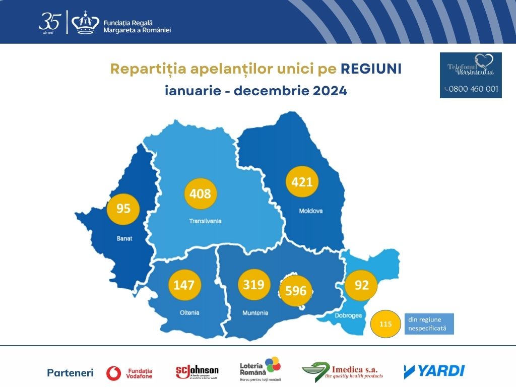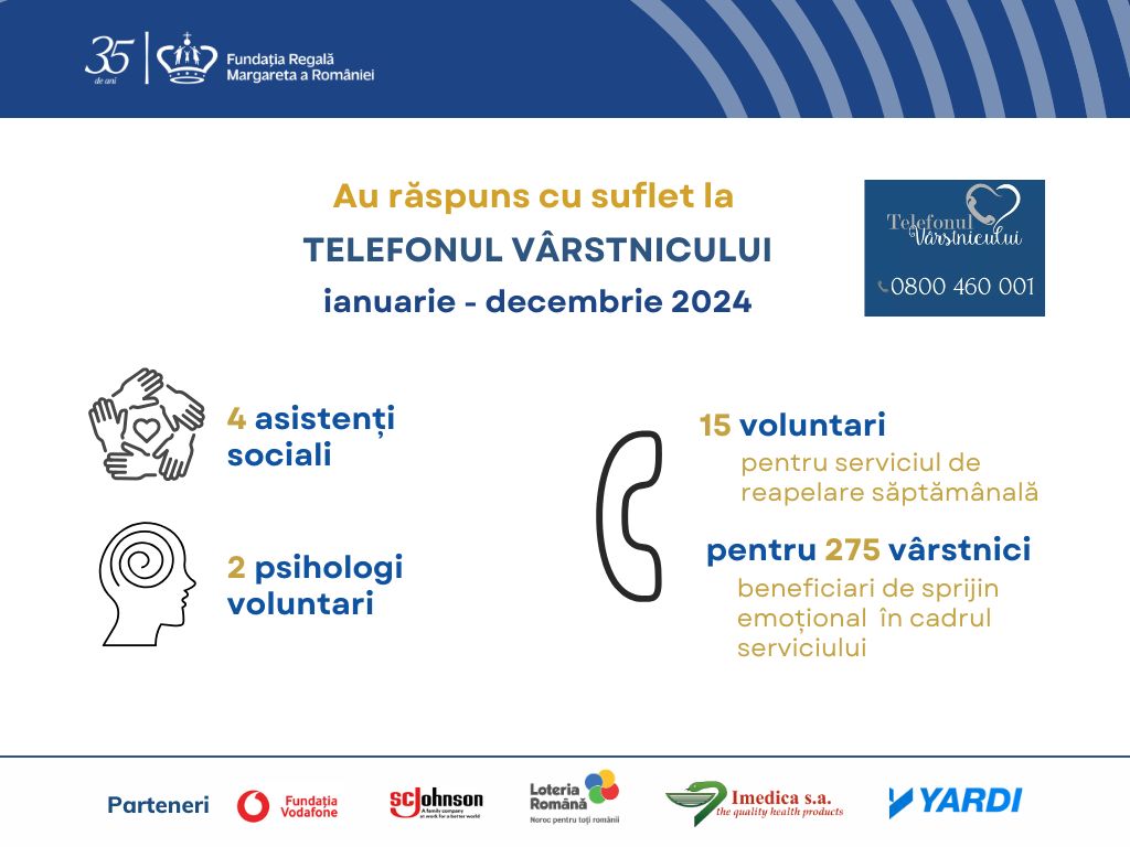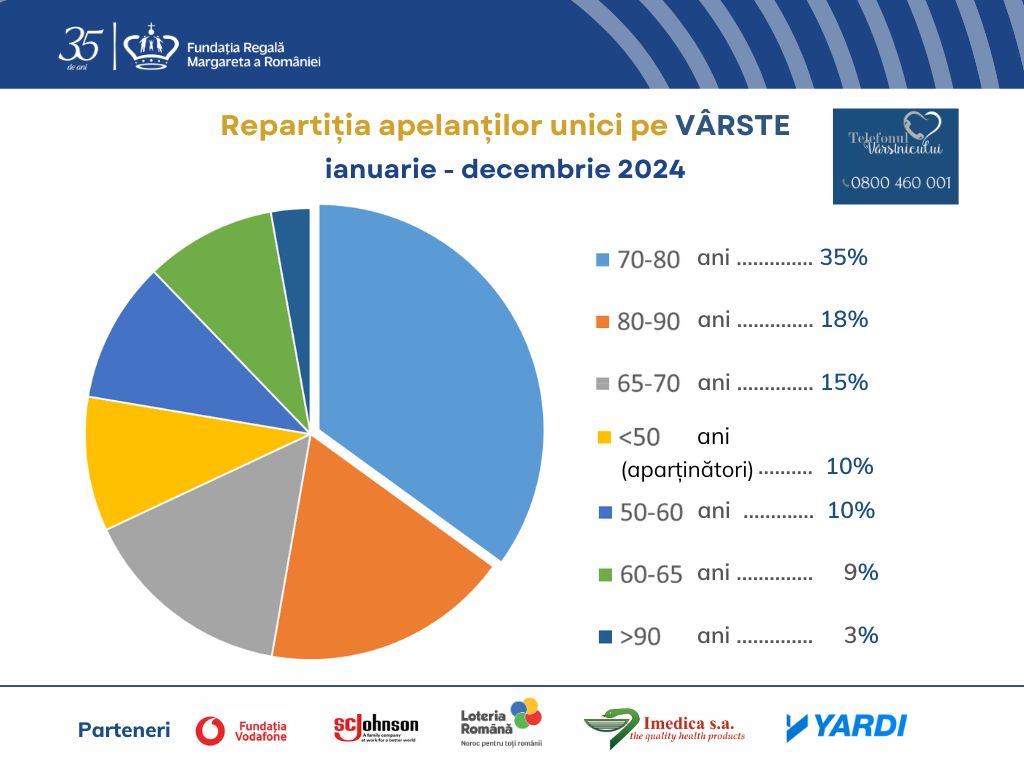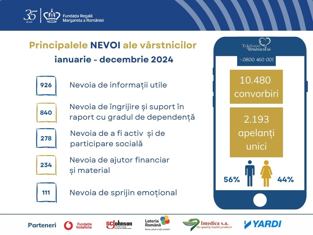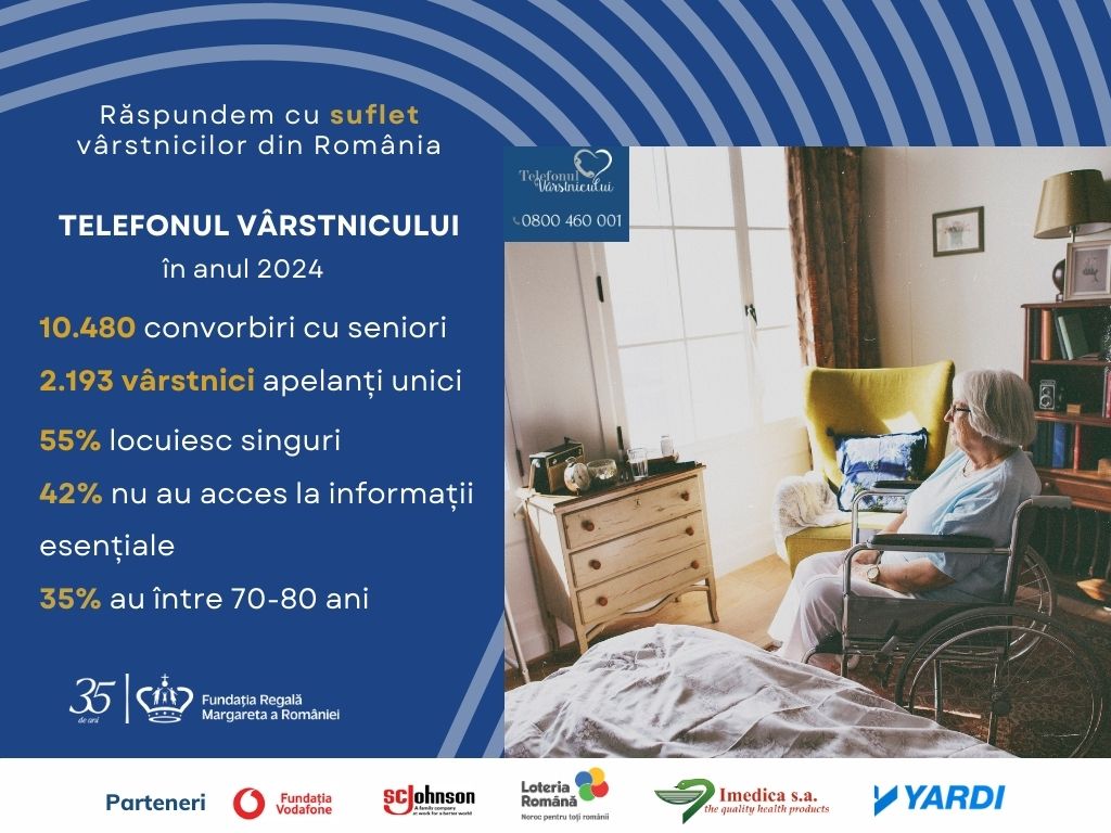 Telefonul Vârstnicului, singura linie telefonică națională gratuită dedicată seniorilor, operat de 9 ani de Fundația Regală Margareta a României, a înregistrat în anul 2024 un total de 10.480 de apeluri, dintre care 2.193 au fost apelanți unici, iar 275 au beneficiat de serviciul de apelare săptămânală. Cifrele reflectă o nevoie crescută de sprijin emoțional, informațional și practic pentru una dintre cele mai vulnerabile categorii demografice din țară. Linia gratuită 0800 460 001, a fost un punct de sprijin pentru seniorii afectați de singurătate, lipsuri materiale, sănătate precară. Ei au găsit ascultare, îndrumare, consiliere socială și psihologică.