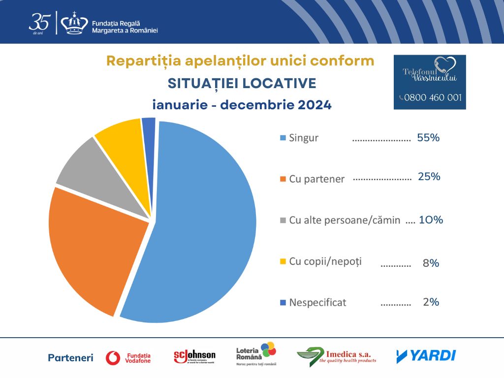 Într-o societate în care 1 din 3 vârstnici trăiește singur, și la Telefonul Vârstnicului 55% dintre apelanții seniori au declarat că locuiesc singuri, ceea ce evidențiază izolarea socială acută cu care se confruntă vârstnicii din România. Alte categorii includ persoane care locuiesc cu parteneri (25%), sau cu alte persoane (10%) sau în gospodării extinse, alături de copii sau nepoți (8%).