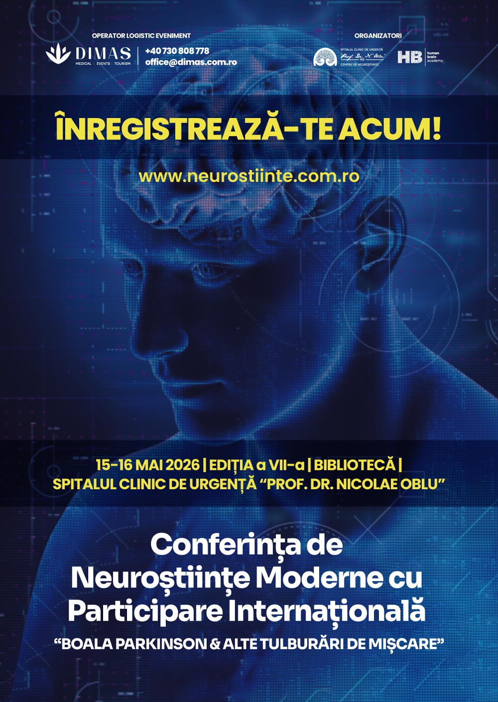 Avem onoarea de a vă anunța că în perioada 15-16 Mai 2026, Iașul revine în atenția întregii comunități medicale din țară prin intermediul celei de a VII-a ediții a Conferinței de Neuroștiințe Moderne “Boala Parkinson & Alte Tulburări de Mișcare” eveniment coordonat de Spitalul Clinic de Urgență “Prof. Dr. Nicolae Oblu” și Asociația „Human Brain Academy” (HBA), cu sprijinul Operatorului Logistic Dimas Events.