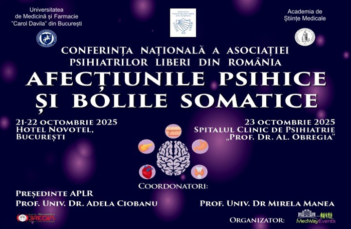 Conferința Națională a Asociației Psihiatrilor Liberi din România „Afecțiunile psihice și bolile somatice”, organizată sub egida UMF „Carol Davila” din București și a Academiei de Științe Medicale, reunește specialiști din diverse domenii medicale pentru a aborda, într-o manieră integrativă, relația complexă dintre sănătatea mintală și cea somatică.