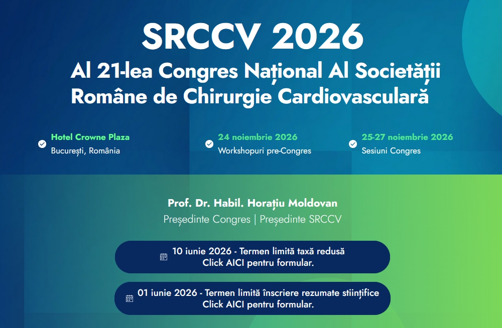 Vă invit cu bucurie să participați la cea de-a 21-a ediție a Congresului Național al Societății Române de Chirurgie Cardiovasculară, care se va desfășura la București, la Hotel Crowne Plaza. Programul va debuta cu workshopurile pre-Congres din 24 noiembrie 2026, iar sesiunile Congresului vor avea loc în perioada 25 – 27 noiembrie 2026.