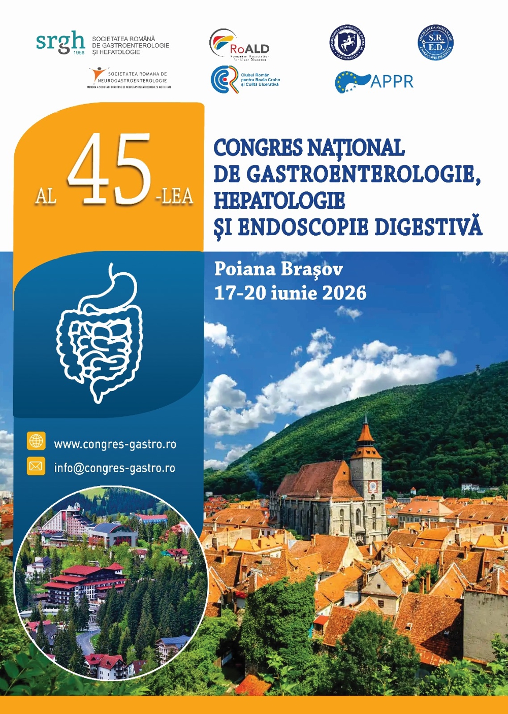 Afisari: 71Vă invităm să participaţi la al 45-lea CONGRES NAȚIONAL DE GASTROENTEROLOGIE, HEPATOLOGIE ȘI ENDOSCOPIE DIGESTIVĂ care va avea loc la Hotel Alpin, Poiana Braşov, în perioada 17-20 iunie 2026 !