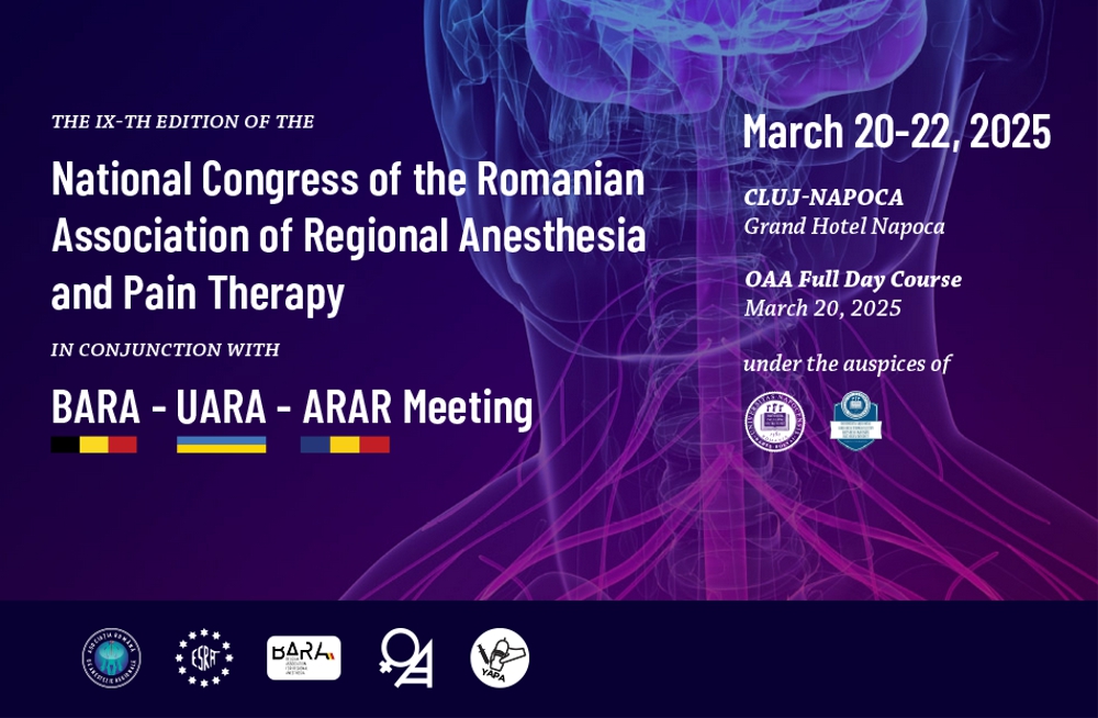 We are excited to invite you to the Annual Congress of the Romanian Association of Regional Anesthesia (ARAR 2025), taking place in the beautiful city of Cluj-Napoca from 20-22 March 2025. This year, we are set to deliver an outstanding program designed to enhance your skills, challenge your knowledge, and inspire your practice in regional anesthesia and pain therapy.