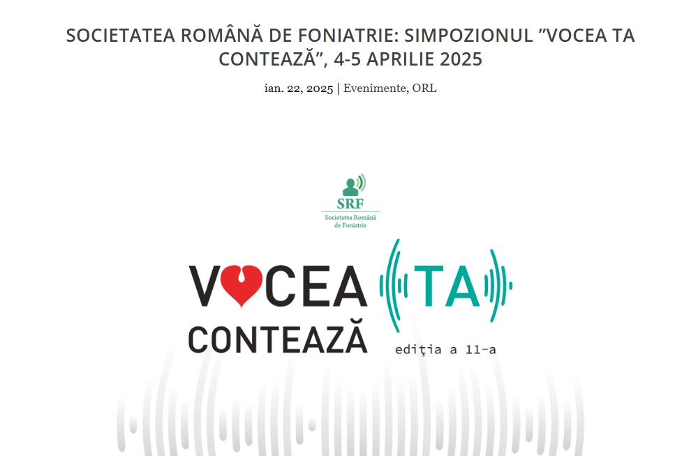 Societatea Română de Foniatrie vă invită la cea de-a 11-a ediție a Simpozionului Național – Vocea Ta Contează, care se va desfășura în format fizic, la Novotel Bucharest City Center, București, în perioada 4-5 aprilie 2025.
