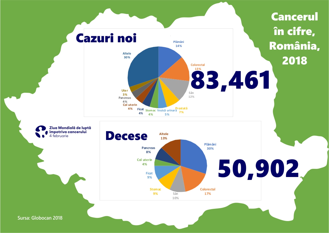 În România, conform ultimelor date Globocan 2018 (Globocan Cancer Observatory)*, în anul 2018** numărul cazurilor nou depistate s-a ridicat la 83.461, în condițiile în care 50.902 români își pierd viața din cauza cancerului. Sunt cifre alarmante și multe dintre ele pot fi considerate decese evitabile, dacă ar exista o strategie corespunzătoare pentru combaterea acestei afecțiuni. Datele au fost sondate din centrele de oncologie din Cluj și Timișoara. Îngrijorător este și faptul că România nu deține un Registru Național de Cancer și prin urmare se estimează că numărul total ar fi mult mai mare.