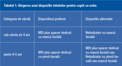 O strategie generală de alegere a inhalatoarelor la copiii cu astm bronşic cu vârsta sub 5 ani, care a fost publicată în Ghidul GINA 2009 este prezentată în Tabelul 1. Principalul factor care influenţează decizia de alegere a unui dispozitiv atât la adulţi cât şi la copii este folosirea corectă a acestuia de către pacient sau, cu alte cuvinte, cel mai bun ghid de prescriere al unui inhalator este de a-l alege pe cel pe care pacientul poate şi îl va folosi corect, iar acest aspect este esenţial pentru eficienţa terapeutică.