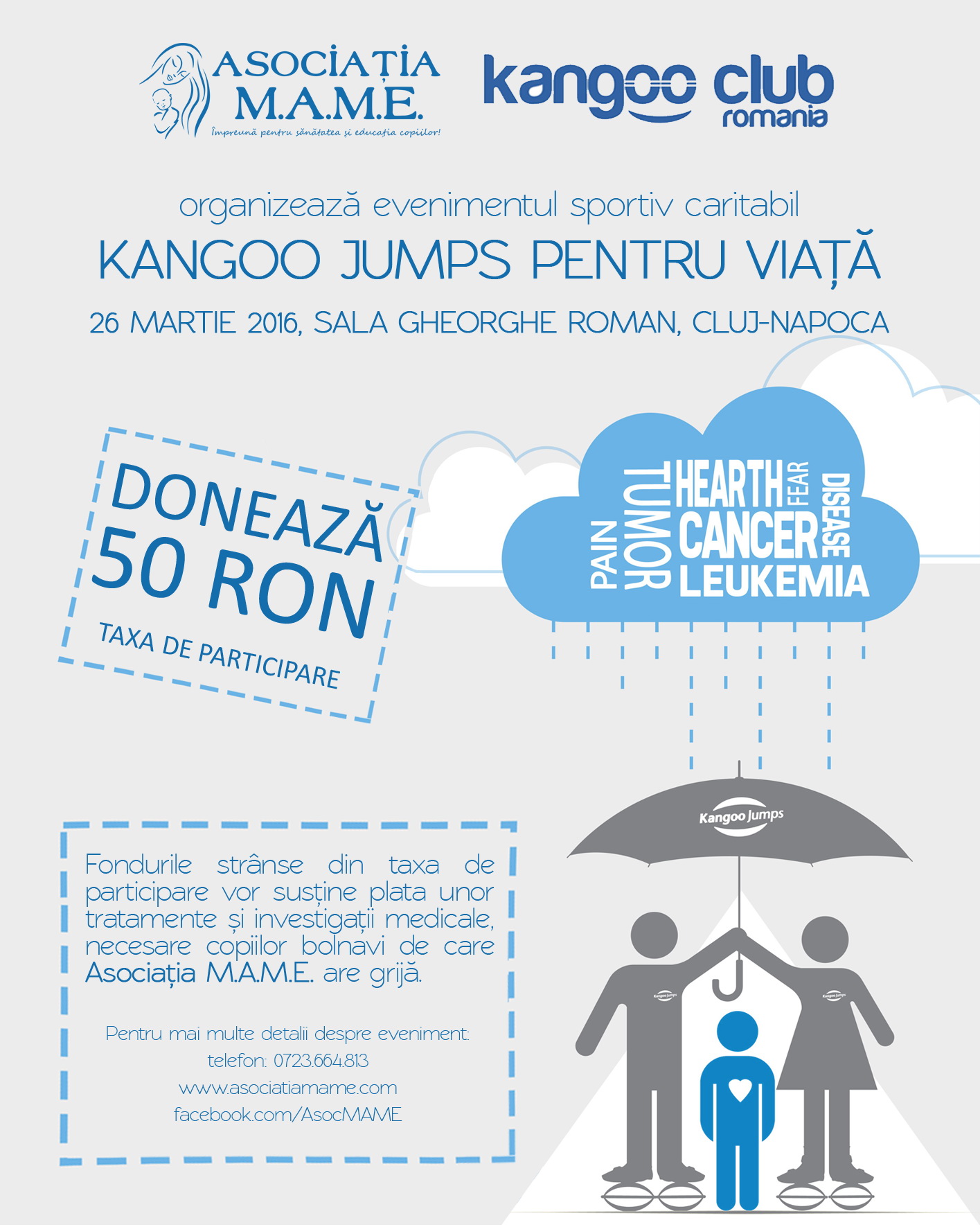 Asociatia M.A.M.E. si Kangoo Club Romaniaorganizeaza pentru al saptelea an consecutiv evenimentul sportiv caritabil “Kangoo Jumps pentru Viata”. Anul acesta, evenimentul va avea loc pe data 26 martie si va fi sustinut, pentru prima oara, la Cluj, la Sala de Sport Gheorghe Roman.