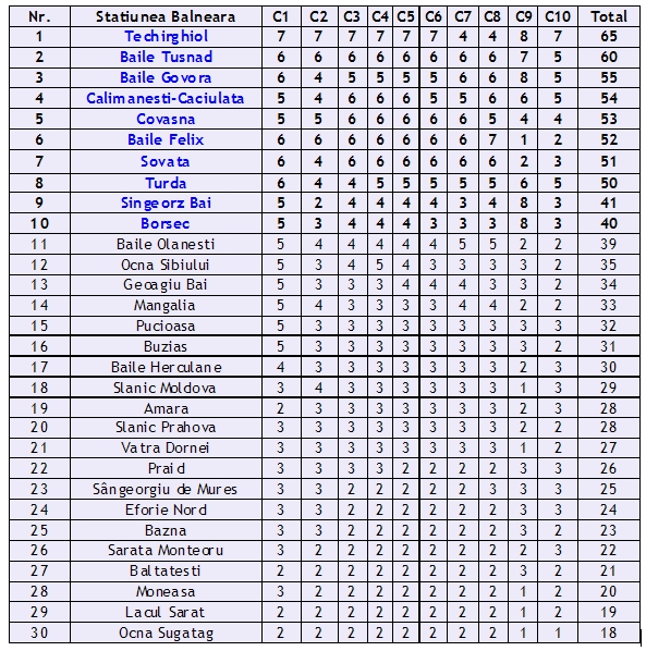Primele 2 statiuni din Topul rezultat prin evaluarea staţiunilor balneare de catre Asociatiatia Romana de Balneologie in baza celor 10 criterii de evaluare, vor avea o pagina de prezentare dedicata, accesibila prin click pe numele statiunii. Primele 10 statiuni balneare vor fi prezentate in cartea TOP 10 STATIUNI BALNEARE disponibila la Editura Balneara, ce va fi editata anual.