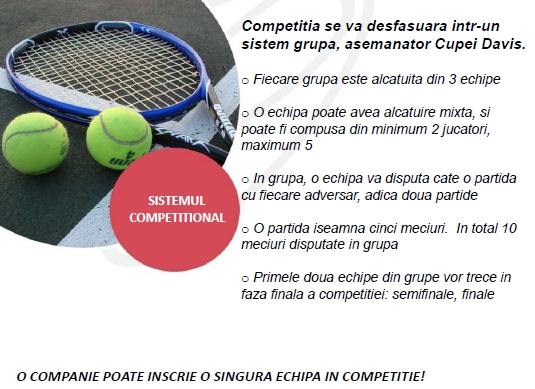 Federatia Romana de Sport Corporatist doreste sa va anunte ca au inceput inscrierile pentru Campionatul National Corporatist de Tenis de Camp. Competitia este dedicata exclusiv angajatilor din companii si se va desfasura in perioada martie – mai 2016, in Complexul Sportiv Tei.