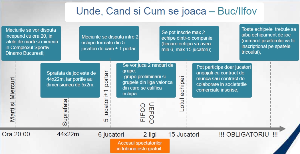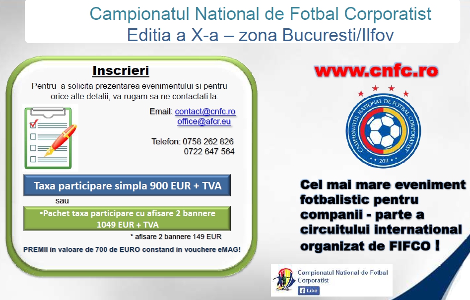 Va invitam sa participati cu echipa companiei dumneavoastra la cel mai mare turneu sportiv din Romania, dedicat sportului corporatist. Campionatul National de Fotbal Corporatist (fosta Cupa “CORNEL DINU” pentru companii), este un team building sportiv, in cadrul caruia angajatii companiilor concureaza pe durata a 3 luni (martie – iunie ), in incercarea de a castiga prestigiosul trofeu. Turneul reprezinta o buna oportunitate de a interactiona cu actualii clienti sau viitori parteneri. Organizat in sistem primavara – toamna, Campionatul National de Fotbal Corporatist, a reusit sa creasca de la an la an, nu mai putin de 165 de companii participand doar in zona Bucuresti/Ilfov (lista completa o gasiti mai jos sau in prezentarea atasata). Dupa ocuparea ultimelor 3 locuri ramase disponibile, vom anunta componenta completa a tabloului participantilor la cea de-a X-a editie.