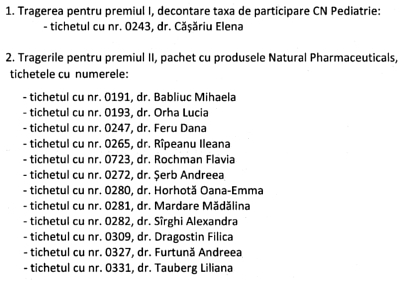 Medicii care au participat la Conferința Națională de Pediatrie, ediția 2018, desfășurată la București între 21-24 martie, au avut oportunitatea de a participa la o tombolă organizată de compania Natural Pharmaceuticals și revista Săptămâna Medicală, cu premii constând în bani și suplimente nutritive. Astfel, toți cei care au completat un chestionar la standul Fin Watch- Săptămâna Medicală, au fost înscriși în tragerea la sorți pentru premiul cel mare constând în decontarea taxei de participare la eveniment, sau unul dintre cele 12 premii constând în pachete de produse Natural Pharmaceuticals.