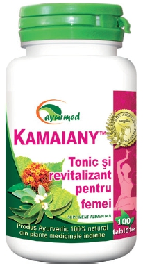 KAMAIANY® - Tonic genital feminin - Menține echilibrul hormonal, psiho-emoțional și tonusul general al femeii. Este un complex de plante ayurvedice care echilibrează balanța hormonală și tonifică aparatul genital feminin. Ajută la reglarea ciclului menstrual și la refacerea endometrului. Amelioreaza simptomatologia din perioada premenstruală și menstruală, contribuind la reducerea până la stoparea hemoragiilor determinate de fibroamele uterine și chisturile ovariene. Aportul de fier natural compensează pierderile cauzate de metroragii și menoragii, iar aportul de calciu natural ajută la menținerea structurii și densității osoase, la coagularea normală a sângelui și la scăderea permeabilității capilare. Susține viața sexuală normală, amplificând libidoul și fertilitatea. Susține capacitatea de adaptare a organismului feminin la stres, suprasolicitare și oboseală oferind o stare de relaxare.