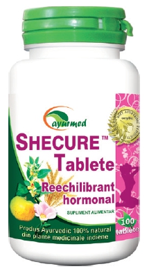 SHECURE® Tablete - Conține plante medicinale ayurvedice care susțin reglarea nivelului hormonal în premenopauză și după instalarea menopauzei, protejază sănătatea organelor genitale feminine și ajută la adaptarea acestora la noile condiții fiziolgice. Prin inducerea calmului și relaxării este prevenită starea psiho-emoțională negativă, modificările bruște de dispoziție și nervozitatea. Reduce fenomenelor neurovegetative (bufeurile). Susține capacitatea de adaptare a organismului feminin la stres, suprasolicitări, oboseală și obținerea de performanțe fizice și mentale. Asigură aportul nutrițional de vitamine și minerale, contribuind la prevenirea diminuării densității osoase și instalarea osteoporozei.