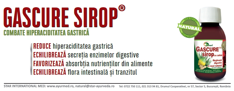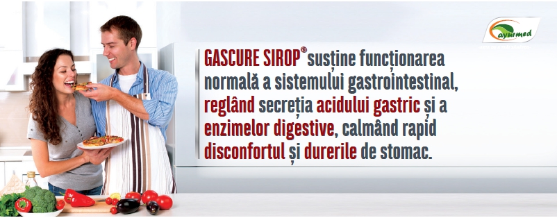 Asadar, GASCURE Sirop, din portofoliul companiei Ayurmed, susține funcționarea normală a sistemului gastrointestinal prin reglarea secreției acidului gastric și a enzimelor digestive la parametri optimi, protejand în același timp mucoasa gastrointestinală. El împiedică agravarea simptomatologiei specifice arsurilor și leziunilor gastrice, calmând rapid arsurile, disconfortul și durerile de stomac.