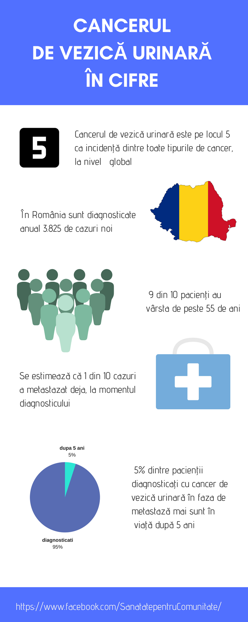 Conform ultimelor statistici Globocan, în România sunt diagnosticate anual 3.825 noi cazuri, însă 1.471 dintre bolnavi pierd lupta cu boala. Specialiştii estimează că aproximativ 1 din 10 cazuri de cancer a metastazat deja, la momentul diagnosticului2. Cancerul de vezică urinară apare mai des la bărbaţi decât la femei, iar 9 din 10 pacienţi au vârsta de peste 55 de ani.3