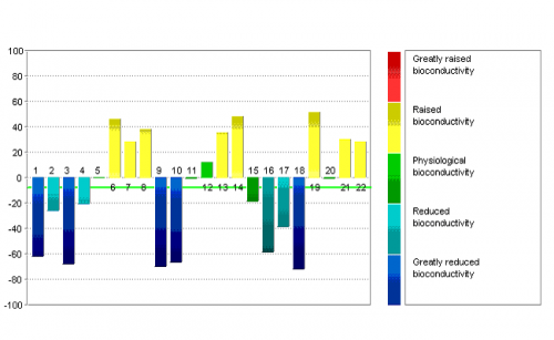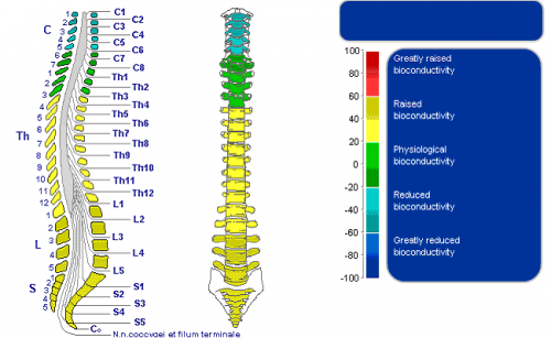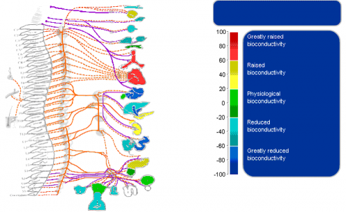 Înregistrarea datelor pe calculator necesită un timp de aproximativ 3 minute. Programul procesează apoi toate aceste date obţinute şi le transformă în imagini (a se vedea mai jos) şi liste de valori. Valorile rezultate sunt comparate cu cele obţinute la persoane sănătoase de aceeaşi vârstă, sex, constituţie fizică etc. Între –20 şi +20 parametrii măsuraţi sunt normali; tot ce iese din aceste limite se consideră patologic, semnificând fie o boală acută, fie una cronică (sau risc de boală).