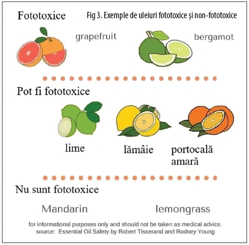 Sunt importante toate detaliile legate de un ulei esențial atunci când îl cumpărăm. Uleiurile de mai sus sunt fotosensibilizante, însă unele dintre ele, obținute prin distilare pot fi folosite în siguranță. Spre exemplu, uleiurile de lime și de lămâie obținute prin distilare NU sunt fototoxice. De asemenea, nu toate uleiurile din citrice sunt fotosensibilizante. Uleiul din portocală dulce (engl. Sweet Orange), uleiurile din mandarină obținute prin presare (engl. Mandarin, Tangerine) NU sunt fototoxice. (Fig. 3).