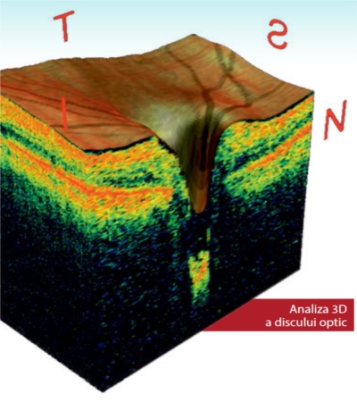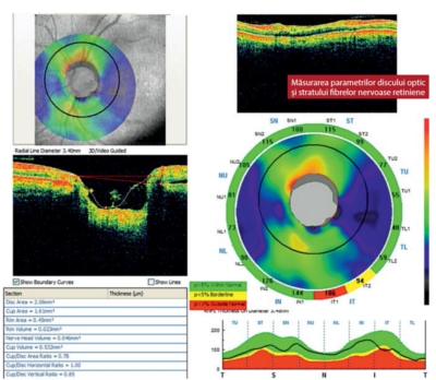 5. Tomografia în coerență optică pentru stratul fibrelor nervoase retiniene, analiza discului optic și stratul celulelor ganglionare maculare. Această investigație este deosebit de utilă pentru diagnosticarea glaucomului chiar în fazele precoce (înaintea modificărilor de câmp vizual), cât și pentru monitorizarea progresiei bolii.