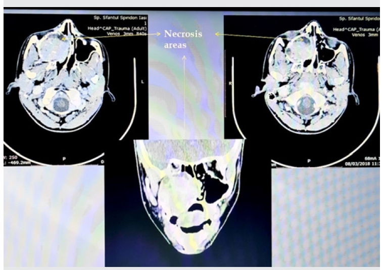 Examenul CT cranio-cerebral efectuat în data de 8.03.2018 a descris o formațiune expansivă cu diametrul de 43/52/54 mm, ce ocupă în totalitate sinusul maxilar drept, cu efect de masă asupra pereților osoși, a căror corticală o subțiază și o întrerupe segmentar.