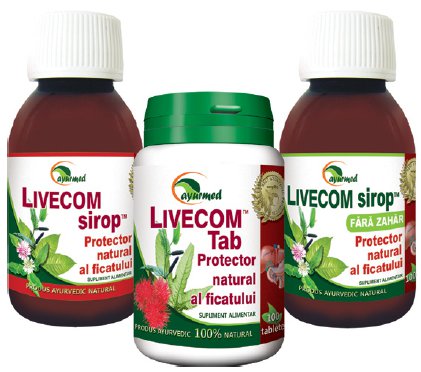 LIVECOM™ Sirop - complex de substanțe bioactive din plante medicinale ayurvedice care susțin procesele metabolice hepatice și funcționarea optimă a vezicii biliare. Stimulează refacerea celulei hepatice lezate și apariția de noi celule, prin favorizarea sintezei de proteine la nivelul ribozomilor. Protejează integritatea membranei celulare hepatice și împiedică pătrunderea în celule a substanțelor toxice provenite din alimentația dezechilibrată, consumul de alcool, folosirea medicamentelor hepatotoxice sau a drogurilor. Fitonutrienții contribuie la protejarea celulelor hepatice împotriva stresului oxidativ, cauză a proceselor degenerative și a îmbătrânirii premature. Susțin ficatul în desfășurarea optimă a proceselor metabolice și în eliminarea deșeurilor și a toxinelor din organism. Asigură absorbția eficientă a nutrienților din tubul digestiv. Complexul activ de plante susține procesul de secreție biliară hepatică și evacuarea normală a bilei din vezica biliară, contribuind astfel la digestia grăsimilor, la metabolizarea lor corectă și la menținerea echilibrului balanței lipidice din sânge.