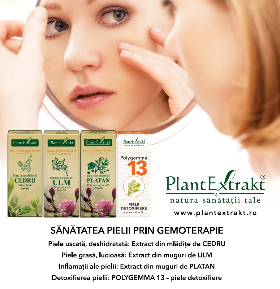 Polygemma 13 piele detoxifiere asociază muguri de Platan, Nuc și sevă de Mesteacăn, cu multiple avantaje: