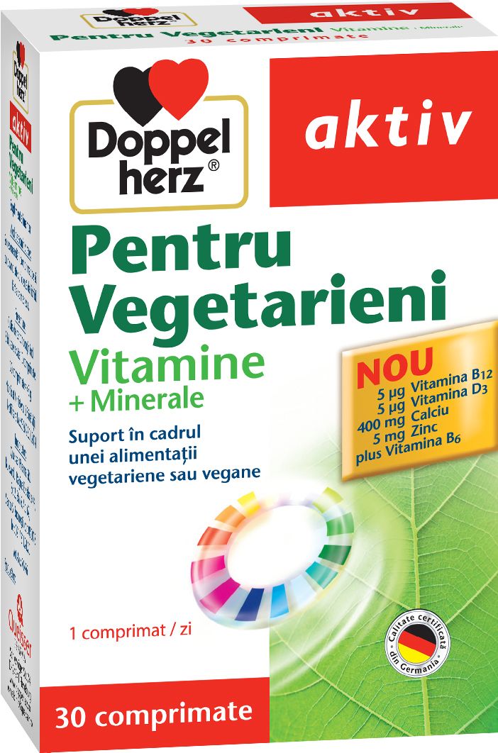 Cu un singur comprimat pe zi de Doppelherz aktiv Pentru vegetarieni obtineti, in cazul alimentatiei vegetariene si vegane, necesarul de vitamine, minerale si oligoelemente.