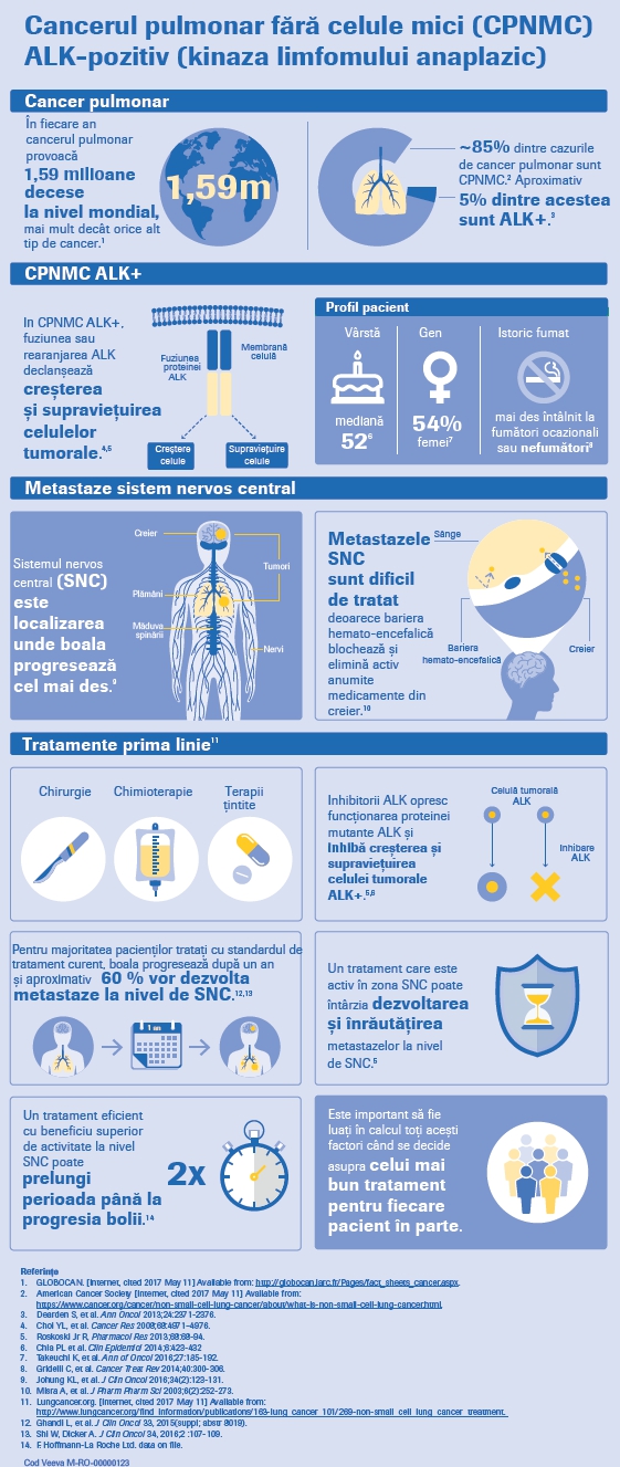 „Cancerul bronhopulmonar reprezintă o importantă problemă de sănătate publică în toată lumea, deoarece frecvent este diagnosticat în stadii avansate, mai ales în țara noastră ca urmare a lipsei screeningului pentru această afecțiune. Fumatul este unul din factorii ce determină apariția acestei boli dar a fost raportată o creștere a incidenței cancerului pulmonar non microcelular, în special adenocarcinom, la nefumători sau la fumătorii ocazionali. Acest nou tratament, destinat pacienților cu neoplasm pulmonar non-microcelular ce prezintă fuziunea genei ALK, oferă acestora o supraviețuire mai îndelungată fără semne de boală și reduce riscul apariției metastazelor cerebrale.”, a declarat Polixenia Iorga, Medic primar Oncologie Medicală, Spitalul Universitar de Urgență București.