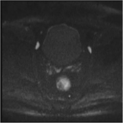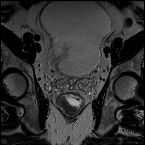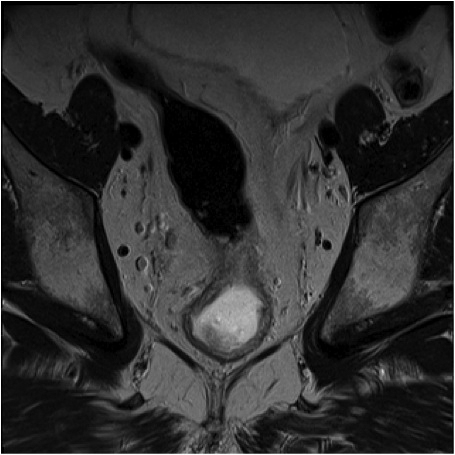 Fig.2. Același pacient post chimio-/ radioterapie – răspuns complet cu dispariția masei tumorale rectale; dispariția restricției de difuzie și reducere în dimensiuni a ganglionilor mezorectali; pacientul a beneficiat de TME şi s-a confirmat histopatologic absenţa ţesutului tumoral (pT0 pN0).