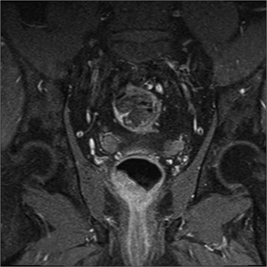 a-d imagini T2 ponderate în plan sagital, oblic axial și oblic coronal – masă tisulară dezvoltată superior de joncțiunea anorectală, lateral dreapta, cu minimă extensie la nivelul grăsimii mezorectale și limfoganglioni mezorectali cu diametru de până la 10 mm;