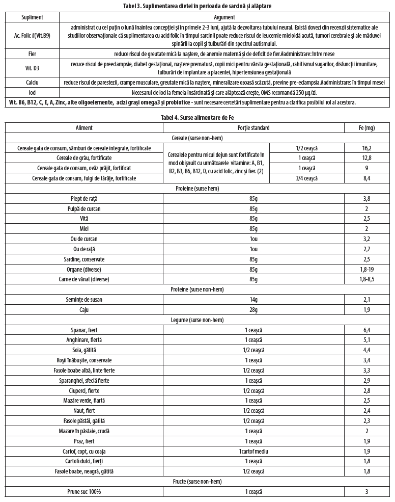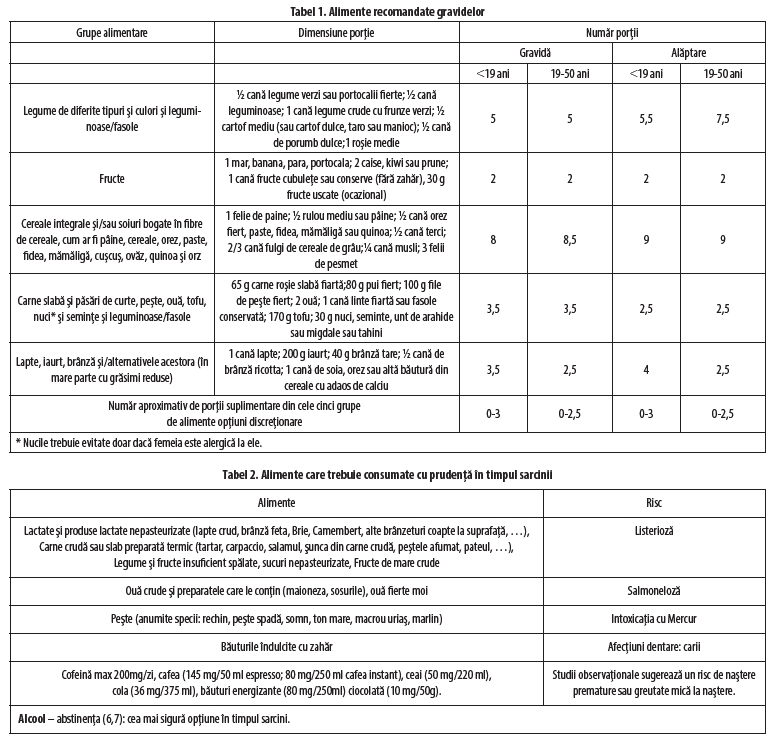 Tabelul 1, cu toate detaliile despre grupele alimentare și porții este un document pe baza căruia gravida și apoi tânăra mamă poate fi ajutată și orientată spre o dietă sanogenă atât pentru ea cât și pentru făt.