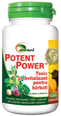Suplimentul alimentar POTENT POWER este un produs natural din plante ayurvedice, cu un conținut bogat de fitonutrienți cunoscuți pentru proprietățile lor privind menținerea sănătății și funcțiilor sexuale normale. Este susținut metabolismul, circulația sanguină, forța și masa musculară, echilibrul hormonal și sexual. Combinația de plante din POTENT POWER, este recunoscută pentru efectele sale de susținere a prostatei, sistemului urinar, libidoului, fertilității și performanțelor sexuale masculine în condiții de stres și suprasolicitare intelectuală și fizică.