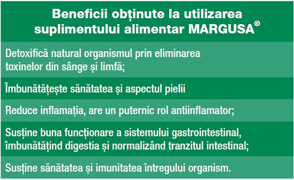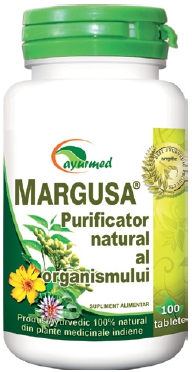 MARGUSA® - Fitocompus din plante medicinale ayurvedice, cunoscut pentru capacitatea de a susţine procesele naturale de eliminare a toxinelor din organsim, acumulate la nivelul organelor (ficat, splină, pancreas etc.). Acțiunea antiinflamatoare, antivirală și antibacteriană determină menținerea sănătății organismului, în situațiile de risc și suprasolicitare fizică și psihică. Contribuie la echilibrarea sistemului imunitar, menținând capacitatea naturală de autoapărare a organismului.