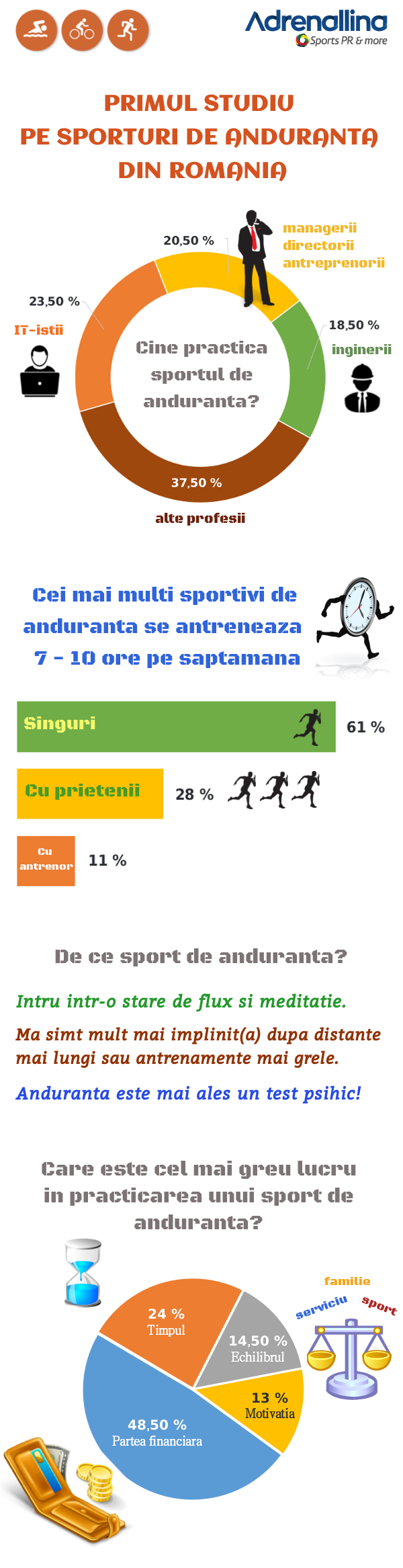 Primul studiu despre sporturile de anduranță din România, derulat de Adrenallina, Sports PR & more, prima agenție de comunicare sportivă din România, relevă câteva detalii interesante despre românii care le practică. (*Prima parte a rezultatelor studiului poate fi consultată aici.)