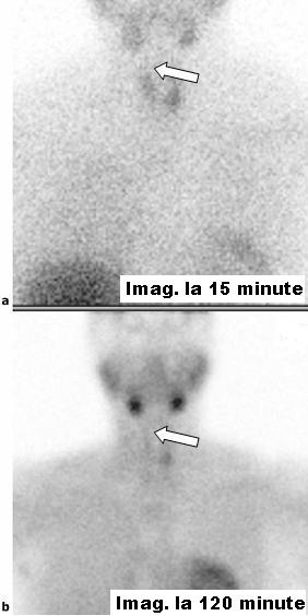 Tc99m-MIBI va fi captată atât de tiroidă cât şi de paratiroide, dar având un proces de eliminare din aceste structuri diferit, se va «spăla» rapid de la nivel tiroidian, rămânând «captiv» la nivel paratiroidian.