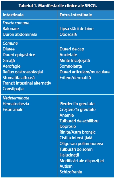 Manifestările clinice sunt diverse, afectând diferite sisteme ale organismului, varietatea lor fiind prezentată în tabelul 1. Întrucât nu sunt metode de diagnostic pe baza unor biomarkeri, acesta rămâne de stabilit pe baza manifestărilor clinice după ingestia de produse alimentare cu gluten, deşi este posibil că nu toate produsele cu gluten să fie incriminate, excluzând, evident, celelalte afecţiuni determinate de intoleranţa/alergia la gluten.