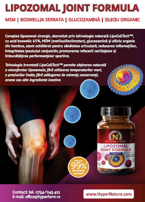 Complex sinergic Lipozomal Joint Formula Hypernatura® asigură absorbția maximă a ingredientelor MSM, extract de Boswellia Serrata, Glucosamină și Siliciu organic datorită încapsulării în lipozomi naturali prin metoda brevetată LipoCellTech.
