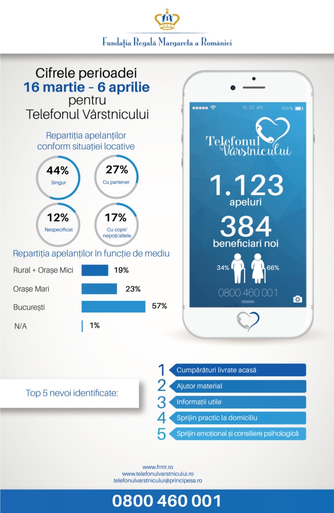 Izolarea la domiciliu și distanțarea socială, impuse de criza coronavirusului, pun persoanele vârstnice în dificultatea de a-și procura bunuri de strictă necesitate, dar și de a interacționa cu alte persoane pentru păstrarea echilibrului psihic. În acest context, Telefonul Vârstnicului, singura linie telefonică națională, gratuită și confidențială dedicată seniorilor din România, a înregistrat un număr dublu de apeluri zilnice din partea persoanelor vârstnice și 384 de beneficiari noi. Telefonul Vârstnicului este un proiect social al Fundației Regală Margareta a României, inițiat în urmă cu patru ani, ca soluție la problema îmbătrânirii populației, vizând creșterea calității vieții persoanelor de peste 65 de ani.