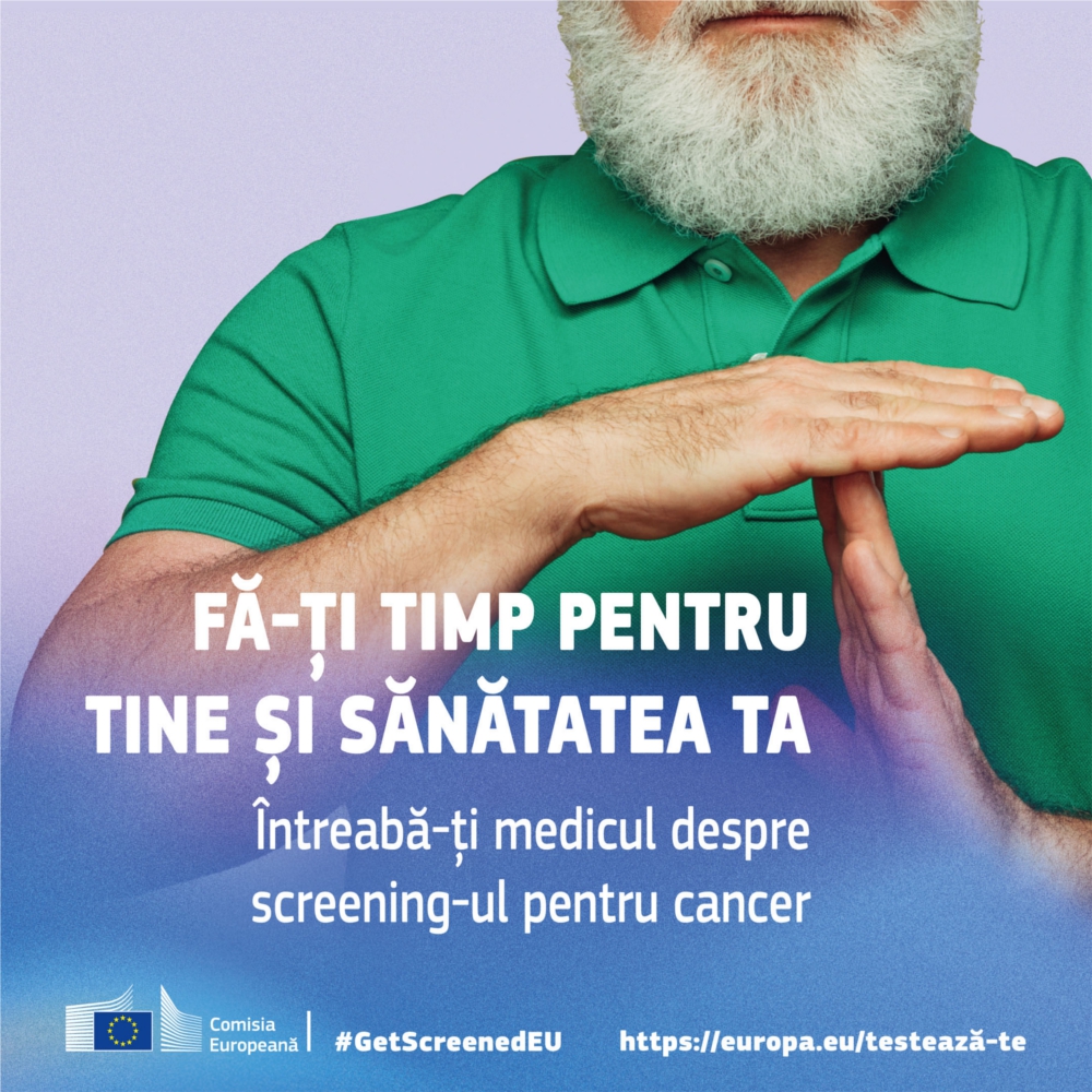 Îndemnul campaniei #GetScreenedEU este unul clar: mergeți să faceți investigații pentru cancerul colorectal, cancerul de sân și cancerul de col uterin, tipuri de cancer care beneficiază de depistare și tratament precoce prin screening. Testările sunt gratuite independent de fondurile naționale alocate lunar, cu trimitere de la medicul de familie, respectând condițiile de eligibilitate.