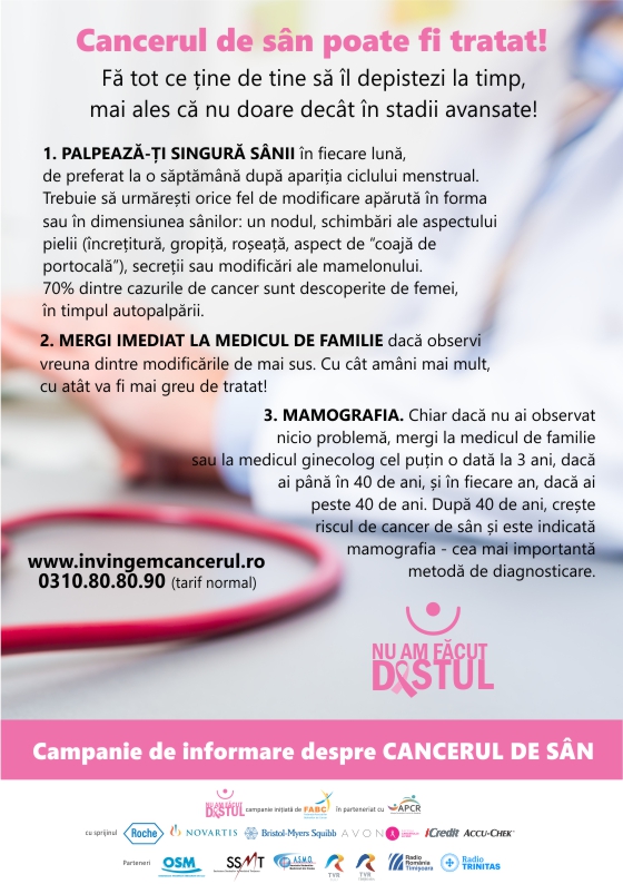 În România, cancerul mamar ajunge să ucidă mai mult de 3000[1] de femei în fiecare an tocmai pentru că nu este decoperit la timp. În lipsa unui program național de screening pentru depistarea precoce a bolii, specialiștii trag un semnal de alarmă și le îndeamnă pe femei să își facă lunar o autoexaminare și, cel puțin o dată pe an, să meargă la control la medicul specialist.