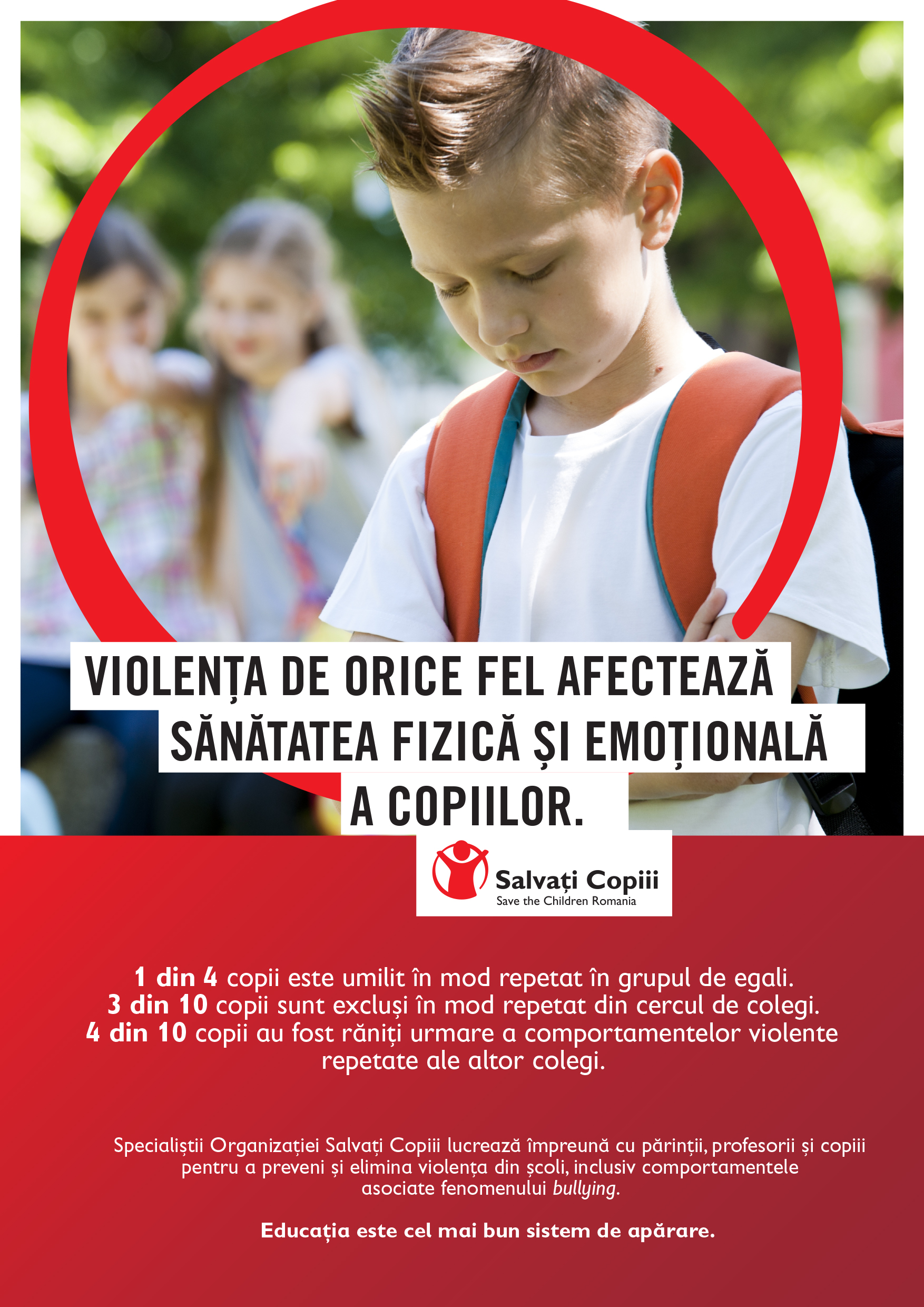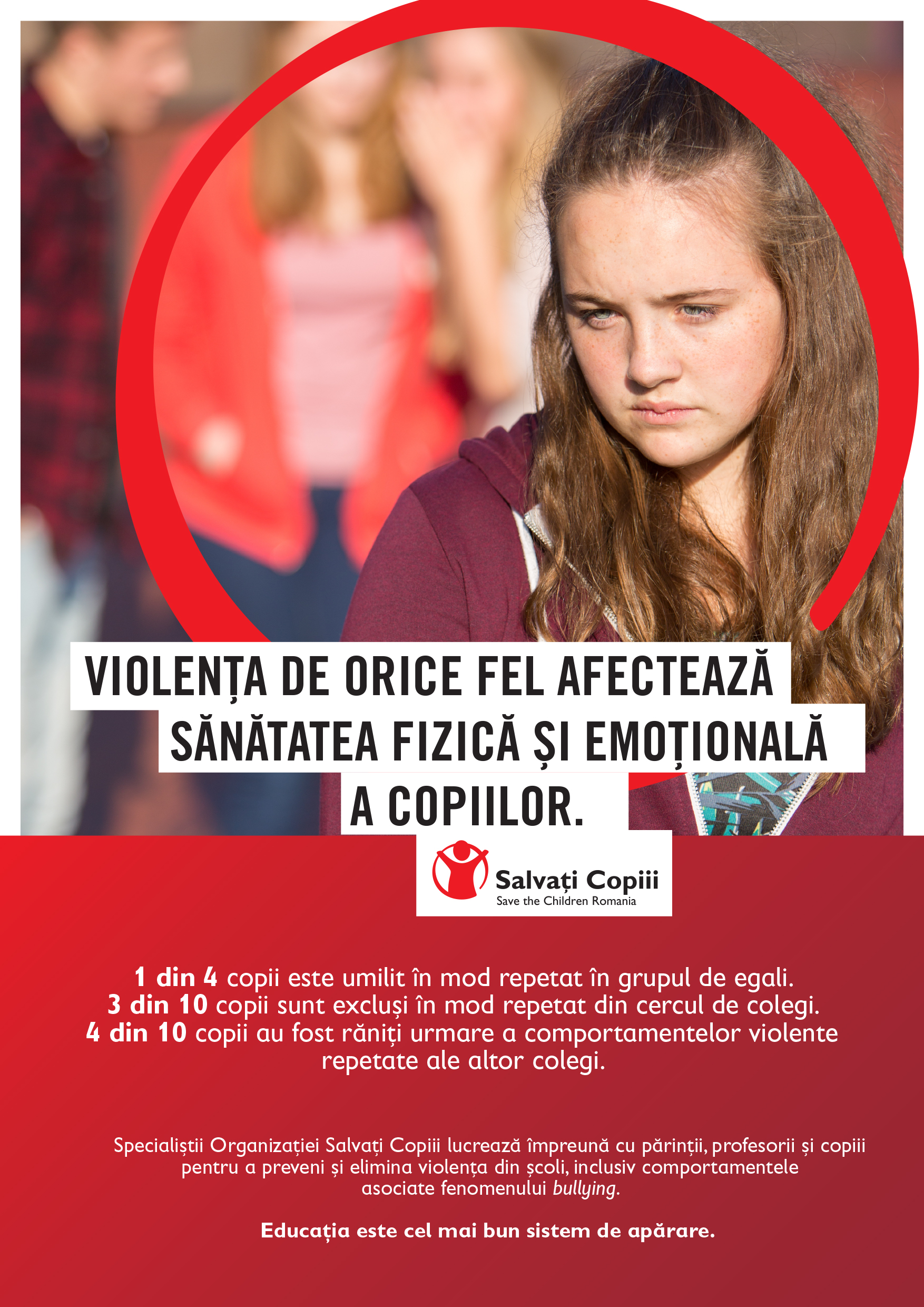 București, 10 mai 2016: Salvați Copiii România lansează astăzi primul studiu național cu privire la fenomenul de bullying în școlile românești, în vederea unei mai bune înțelegeri a motivelor care stau la baza acestor comportamente de violență între copii şi a dimensiunii acestui fenomen în contextul educațional din România.