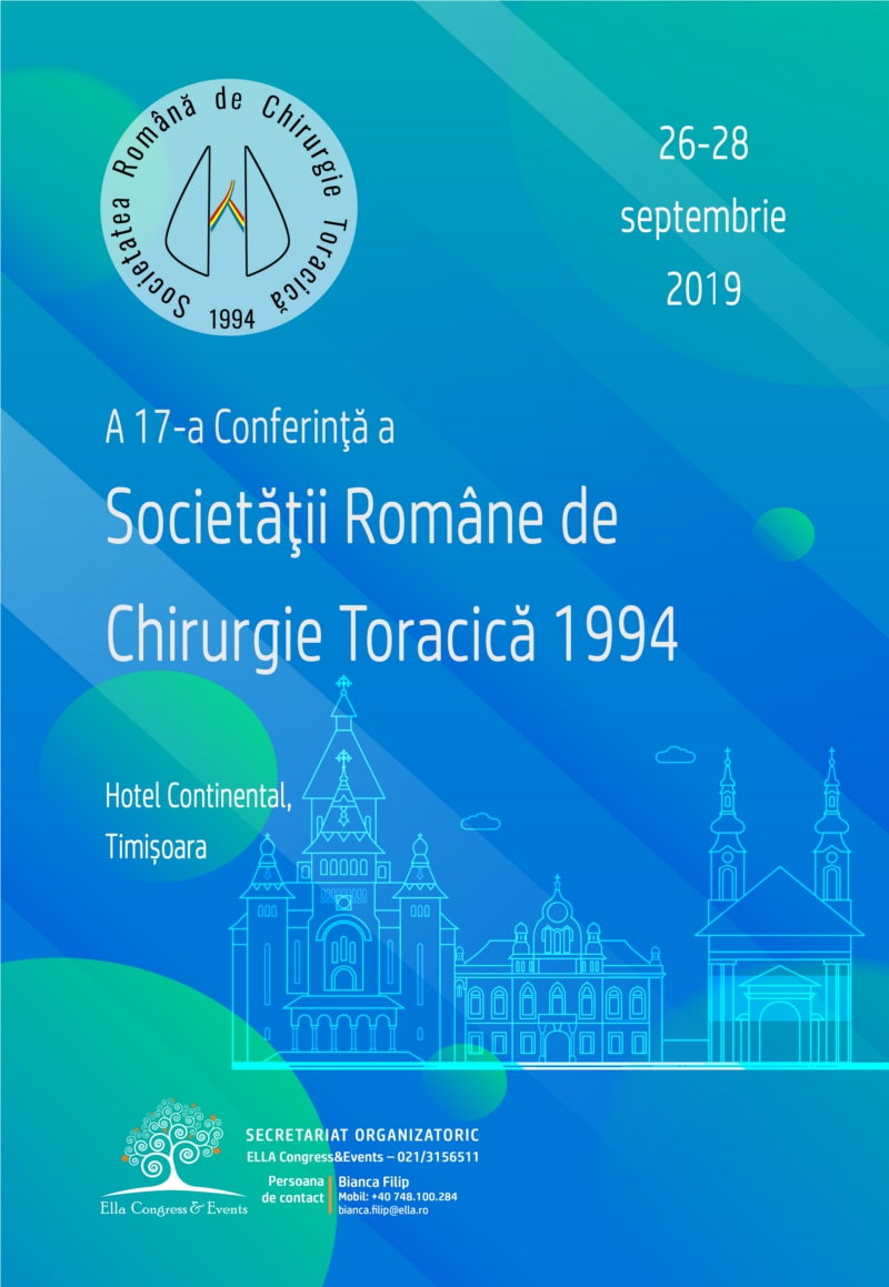 Afisari: 2216A 17-a Conferință a Societății Române de Chirurgie Toracică va avea loc în perioada 26-28 septembrie, la Timișoara, unul dintre cele mai frumoase orașe din România, orașul rozelor și al libertății, viitoare capitală culturală europeană. Calitatea programului va fi asigurată prin participarea a numeroși specialiști din țară și din străinătate, care au fost invitați să împărtășească din experiența domniilor lor pe varii teme de chirurgie toracică.