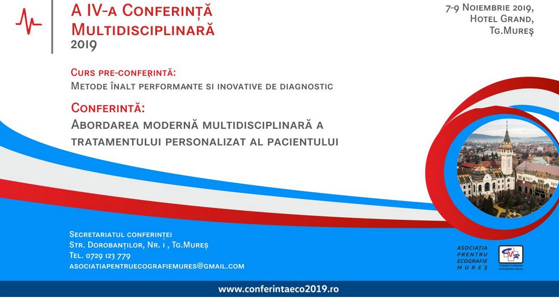 Cu deosebită plăcere vă adresăm invitația de a participa la a IV – a Conferinta multidisciplinara: Abordarea moderna multidisciplinara a tratamentului personalizat al pacientului, organizata la Tg.Mures, in perioada 7-9 Noiembrie 2019 de către Asociatia Pentru Ecografie Mures