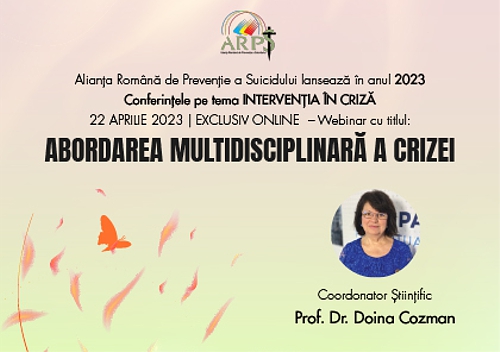 Alianța Română de Prevenție a Suicidului organizează conferința cu tema: “Abordarea multidisciplinară a crizei”, care va avea loc pe data de 22 aprilie 2023, online.