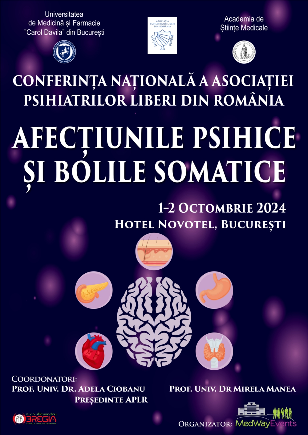 Conferința Națională a A.P.L.R., „Afecțiunile psihice și bolile somatice”, se va desfășura în perioada 1-2 octombrie 2024 la București, Hotel Novotel și va aduna personalități marcante din domeniul psihiatriei, neurologiei, neurochirurgiei, medicinii legale, gastroenterologiei, geriatriei, bolilor infecțioase, diabetului și bolilor de nutriție, alergologiei, oncologiei, endocrinologiei, dar și din alte specialități medicale și chirurgicale.