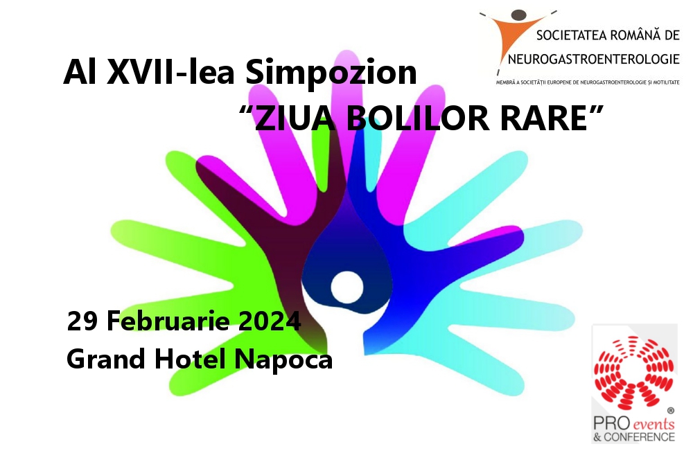 Avem plăcerea de a vă invita la al XVII-lea Simpozion “Ziua Bolilor Rare”, organizat de Societatea Română de Neurogastroenterologie. Evenimentul va avea loc la Grand Hotel Napoca din Cluj-Napoca, pe data de 29 Februarie 2024.