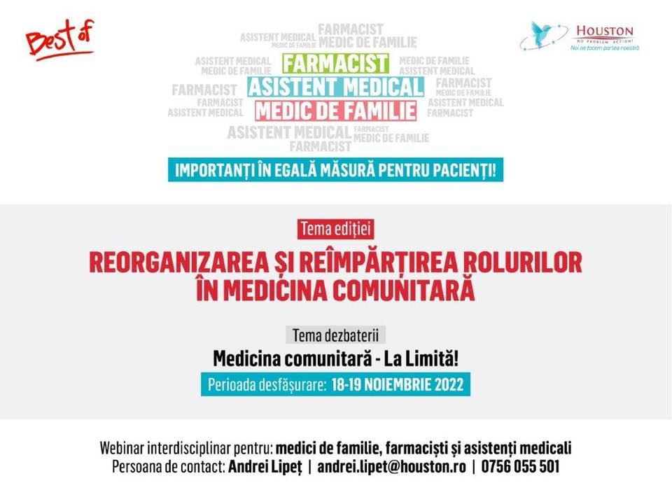 Pe 18-19 noiembrie veniți la webinarul Best OF- Reorganizarea și reîmpărțirea rolurilor în medicina comunitară pentru a trage linie și a stabili în echipă, prin intermediul unor prezentări interactive bazate pe patologii și tratamente frecvent întâlnite în cabinete/ farmacii, strategia bazată pe principiul împărțirii rolurilor: fiecare specialist trebuie implicat pe baza celor mai puternice cunoștințe și abilități de care dispune.